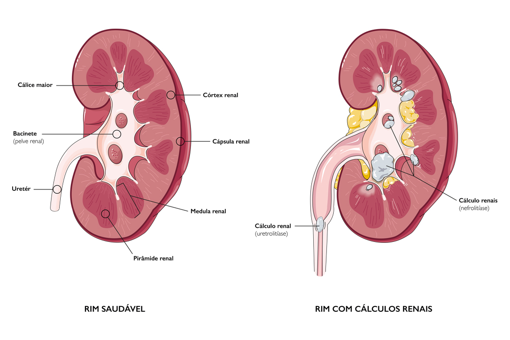 Illustration of an healthy kidney and a kidney with multiple kidney stones.