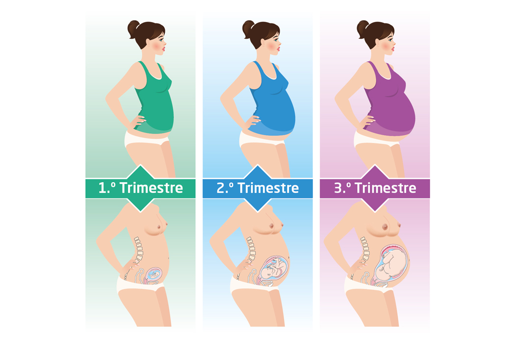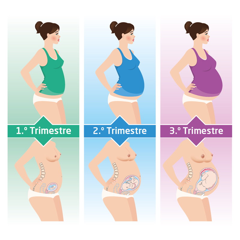 Ilustração sobre as alterações anatómicas que ocorrem na mulher durante a gravidez e sobre o desenvolvimento fetal em três fases distintas da gestação.