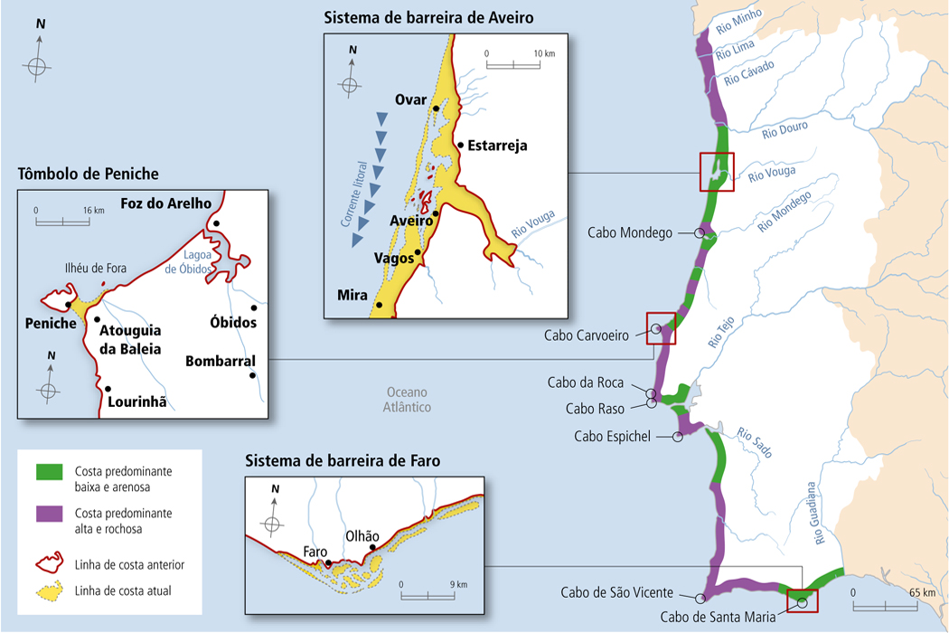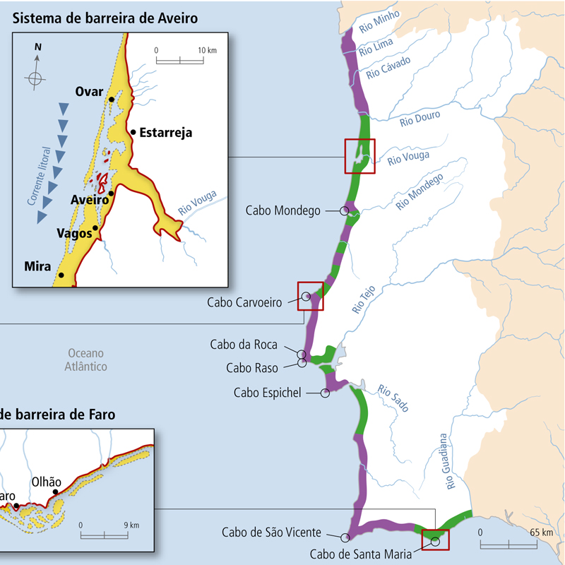 Mapa sobre os principais tipos de costa em Portugal continental, com exemplos de acidentes do litoral.