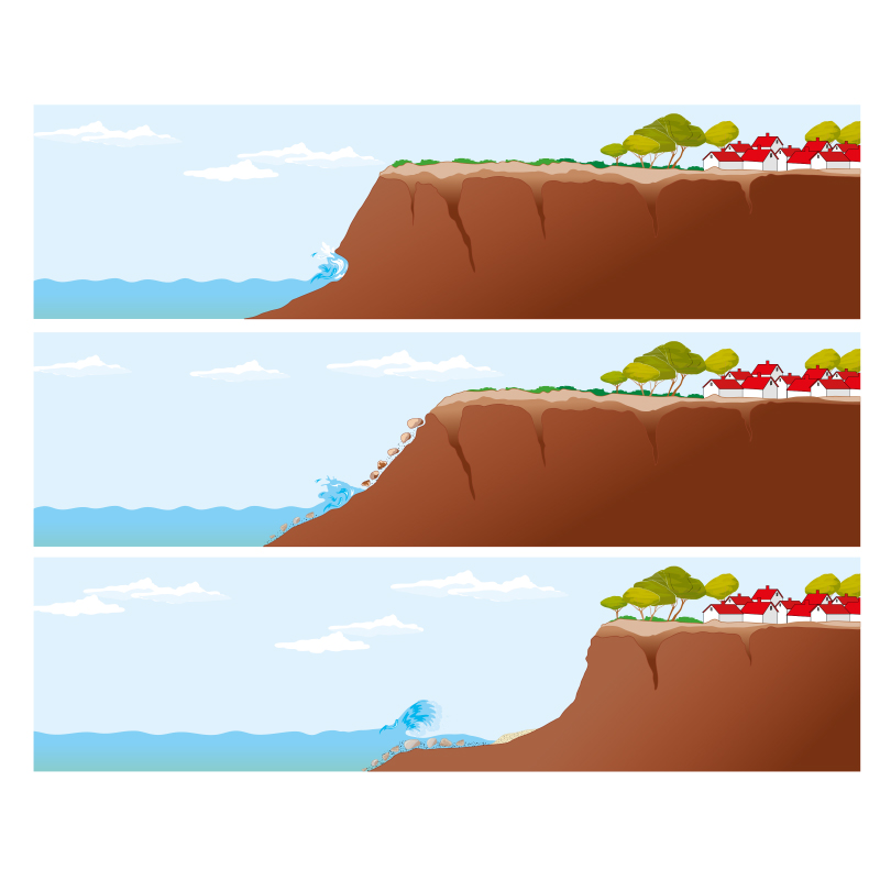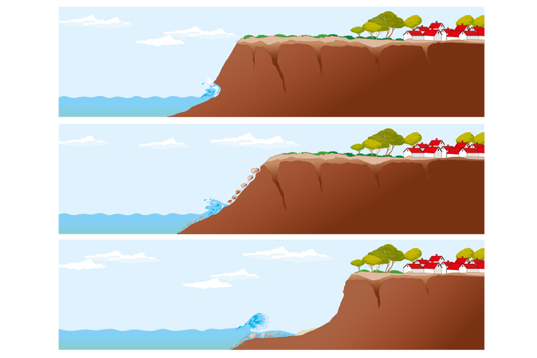 Ilustração sobre o processo de erosão das falésias ao longo da costa, realizada para um livro de Geografia.