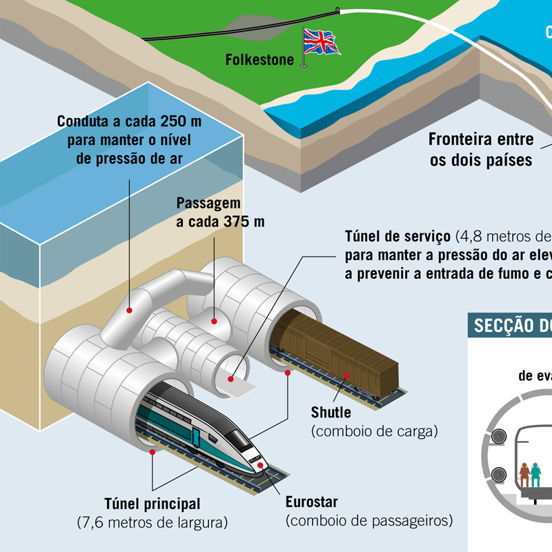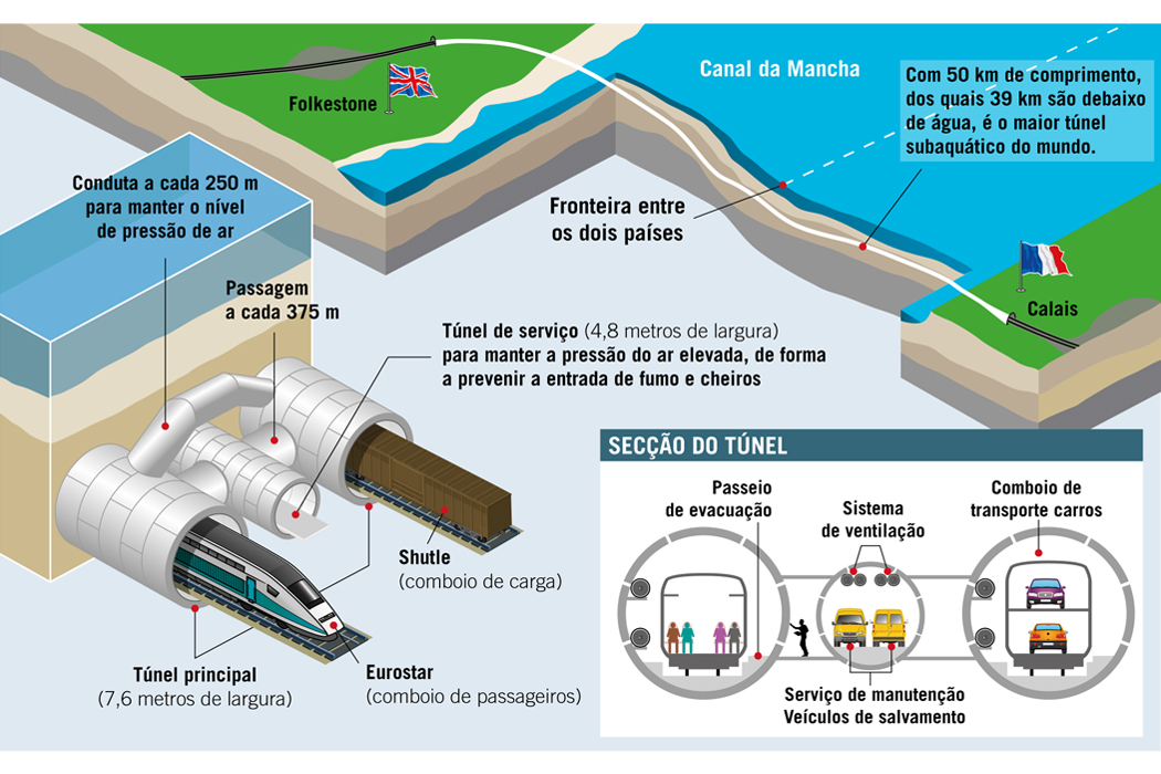 Ilustração sobre a localização do Eurotúnel e as principais características.