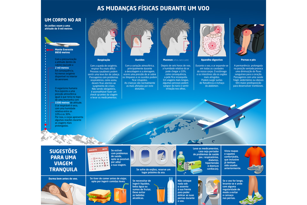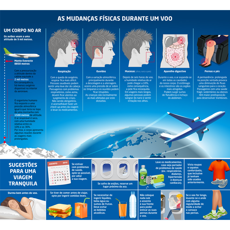 Criação de infografia sobre as mudanças físicas que o ser humano sofre durante os voos de longa duração e alguns conselhos úteis para minimizar estes efeitos e realizar uma boa viagem.
