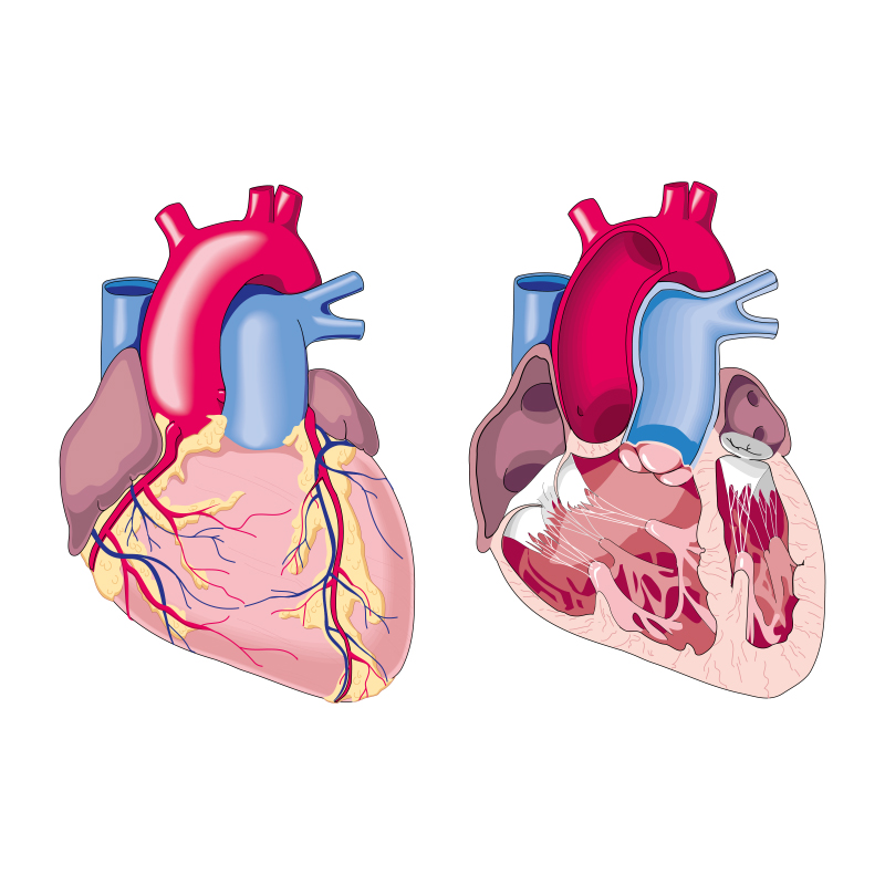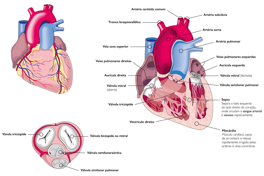 Ilustração sobre a anatomia do coração humano: visão exterior, interior e das quatro cavidades.