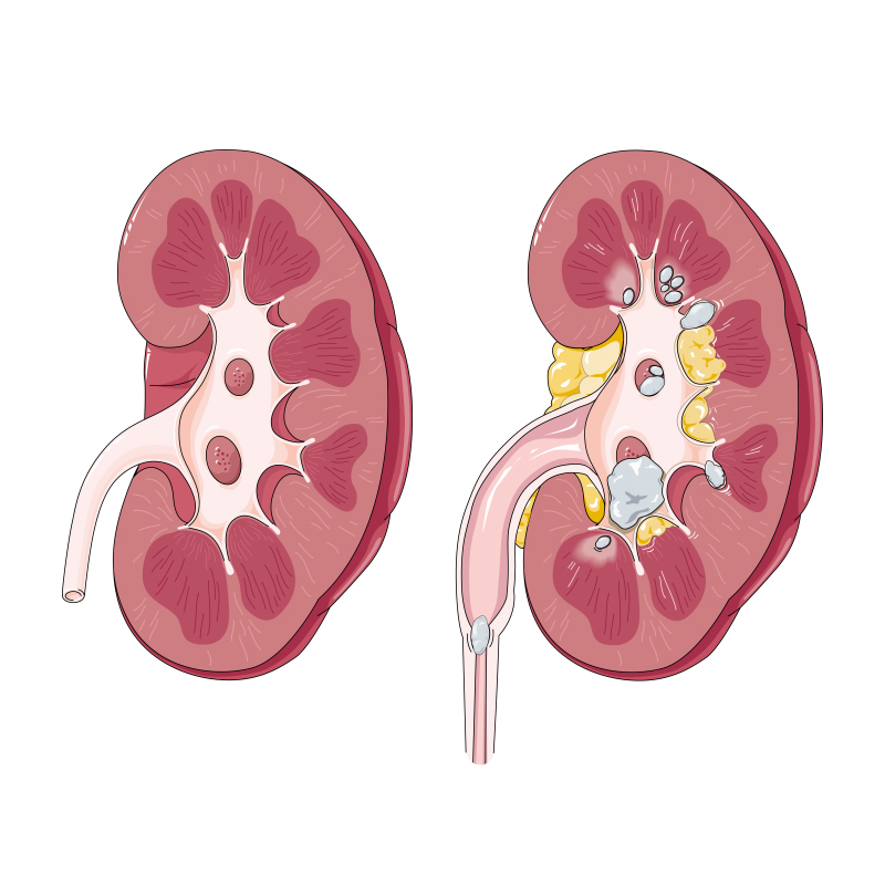 Ilustração de um rim saudável e de um rim com vários cálculos renais.