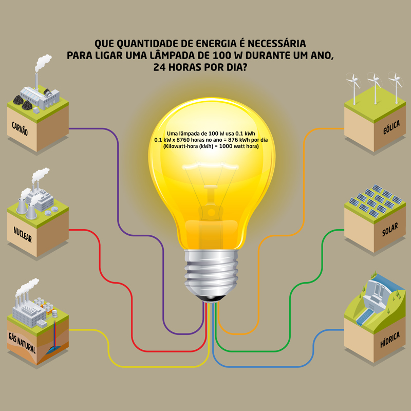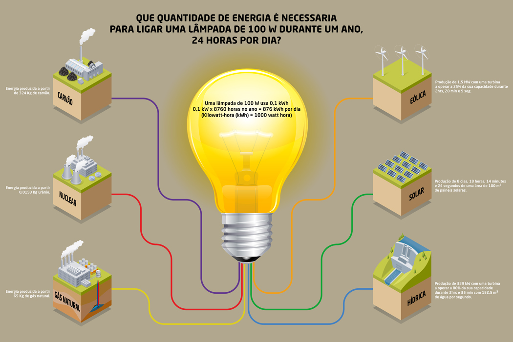 Criação de infografia sobre energia, onde é abordado o consumo anual de uma lâmpada de 100 W, e comparado com diferentes fontes de energia.