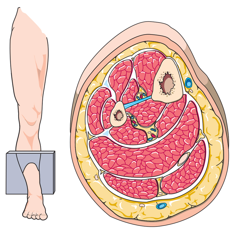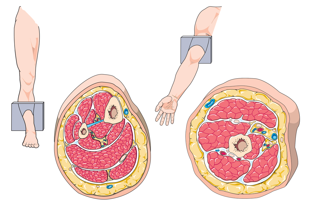 Ilustração do corte de uma secção de perna e de braço, realizada para um livro de Ciências Naturais.