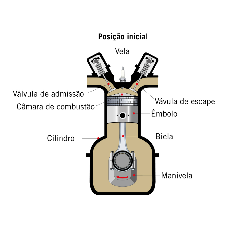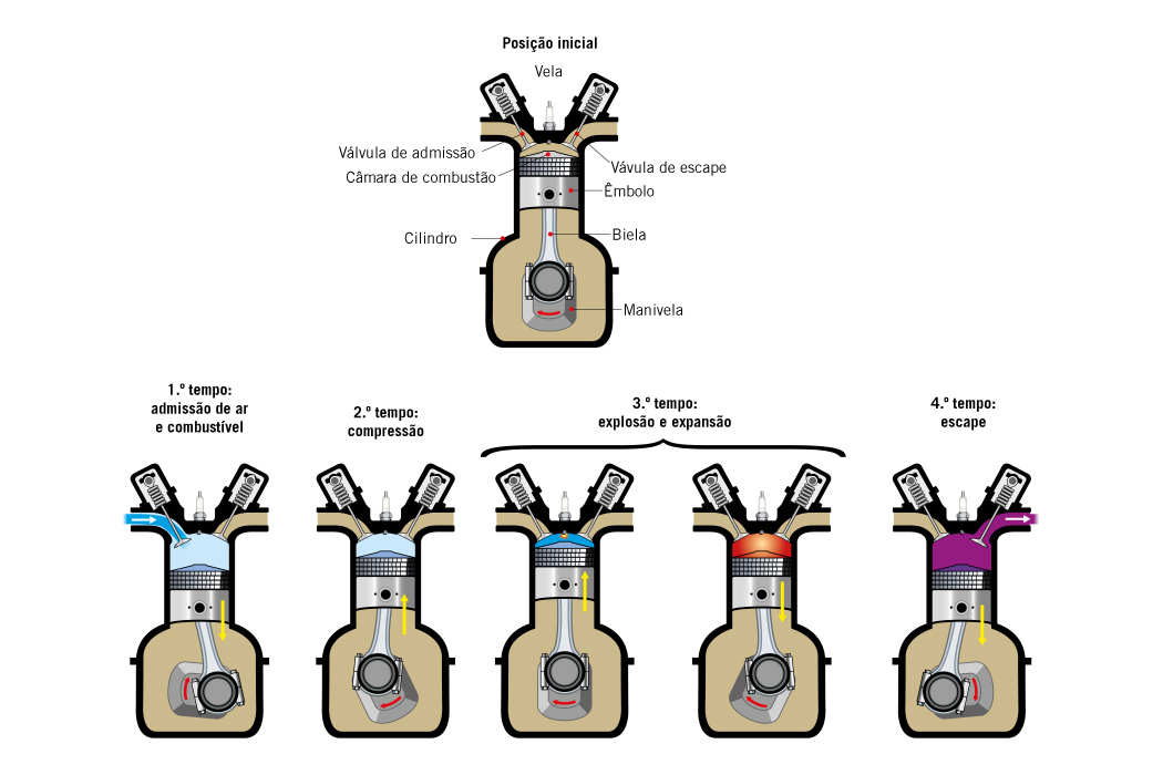 Ilustração sobre o funcionamento de um pistão desde a posição inicial até ao quarto tempo.