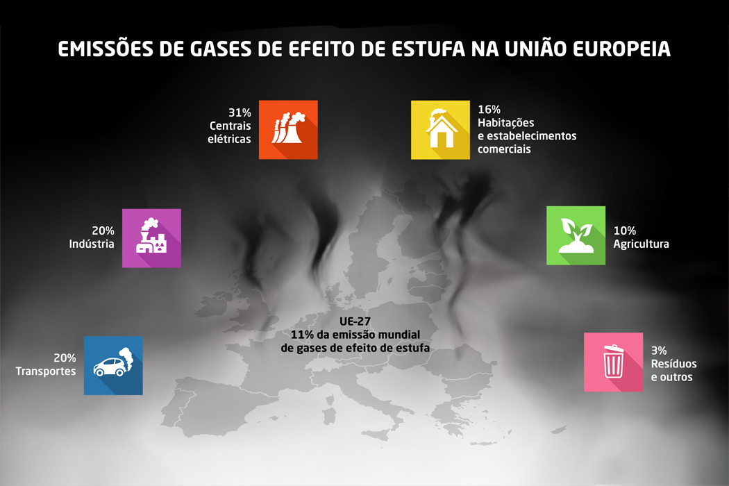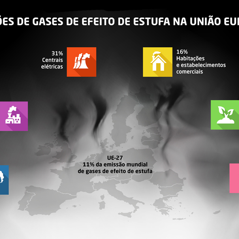 Criação de infografia sobre as emissões de CO2 na União Europeia. A abordagem estatística é comparativa ao resto do mundo e dividida por setores de atividade.