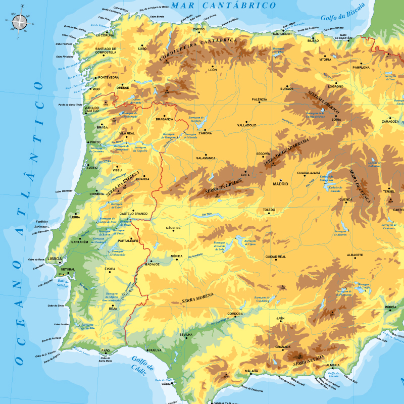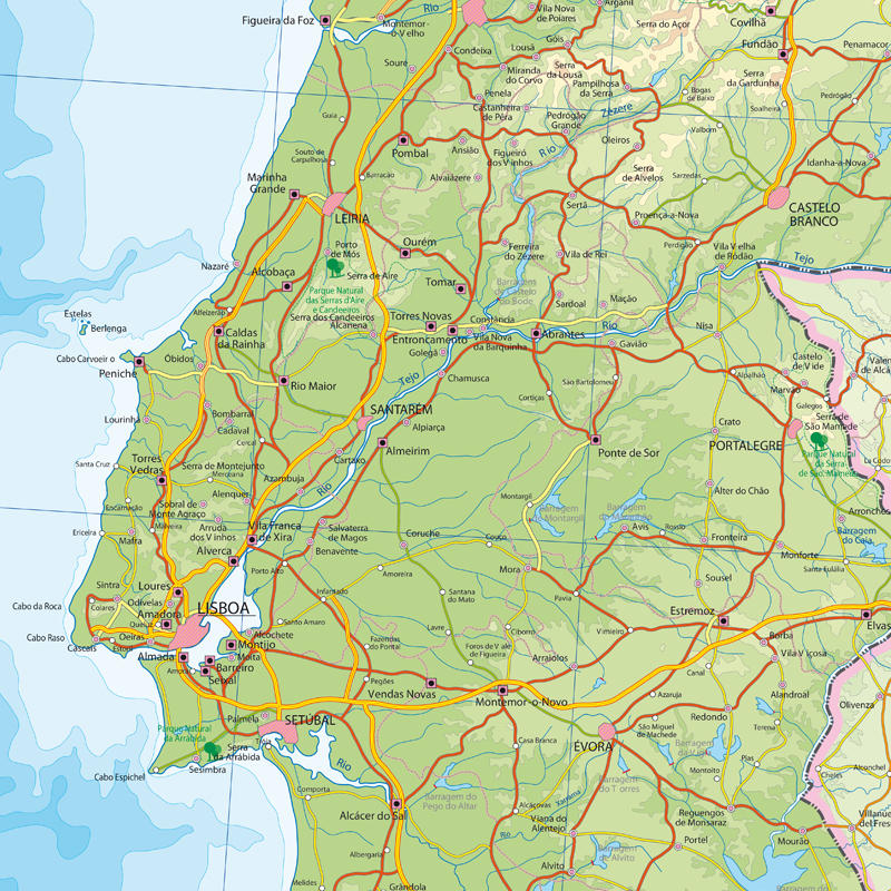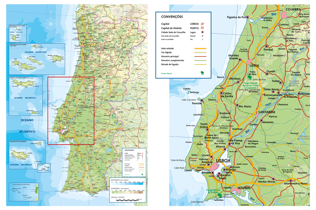 Mapa de Portugal com os seguintes níveis de informação: batimetria, altimetria, cidades, capitais de distrito, estradas principais, parques nacionais e outros.